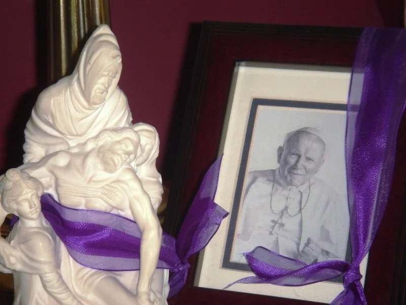 God sends us people to help carry our crosses, too. Stephen's Godmother has come in (a bit like a lady with a magic wand) and tied purple ribbons on all our religious art. She also cooked and cleaned:-). Everywhere we look, we see simple reminders of the season.